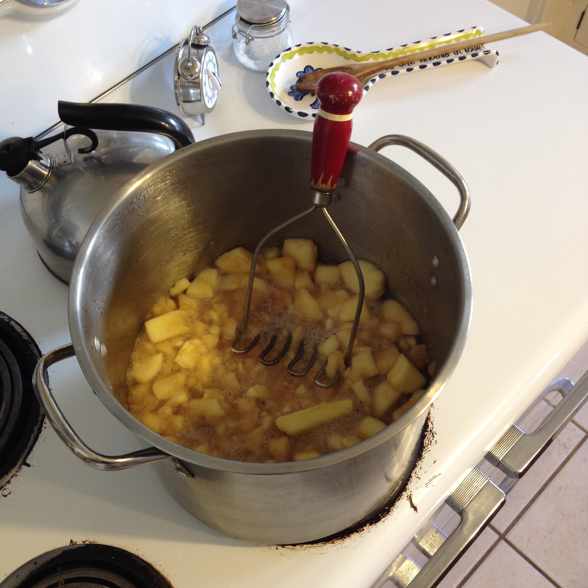 After 30 minutes on the fire, the apples broke down about 50%, with the other 50% being soft enough to smush with a smusher (or what adults will call a potato masher).  I took it off the stove and set it on a heat pad on the counter so I could commence with the smushing.  This was the fun, fun part, because now I was actually making applesauce.  With each smush I could actually see the finished product taking shape.  Since this was homemade applesauce, I preferred to keep it a little chunky.  For me, it looks prettier with bits of apple.